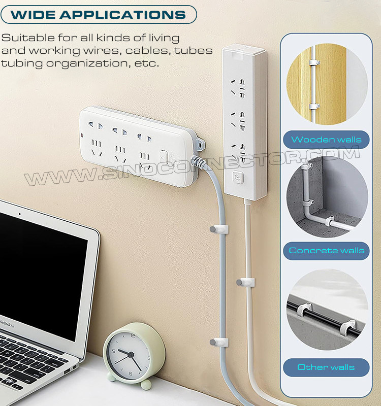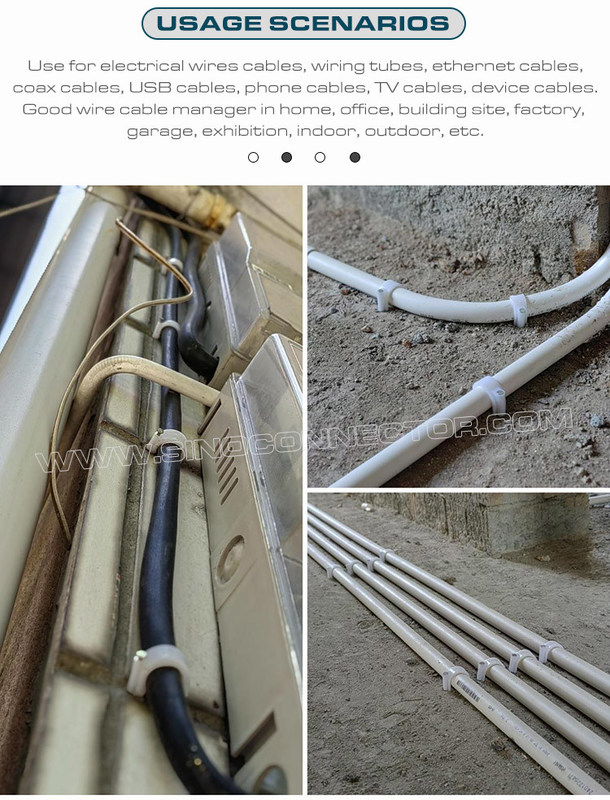 Estes suportes de cabos ou organizadores de cabos são perfeitos para cabo coaxial RG8X, RG58, RG59 ou LMR 240, cabo coaxial de áudio ou vídeo digital RG6, cabo de rede Ethernet Cat 5, Cat 6, fio de coluna, fio de telefone , cabo USB, luz de Natal etc. A organização dos cabos pode também melhorar a segurança da utilização da eletricidade e proteger a segurança dos membros da família, especialmente das crianças.