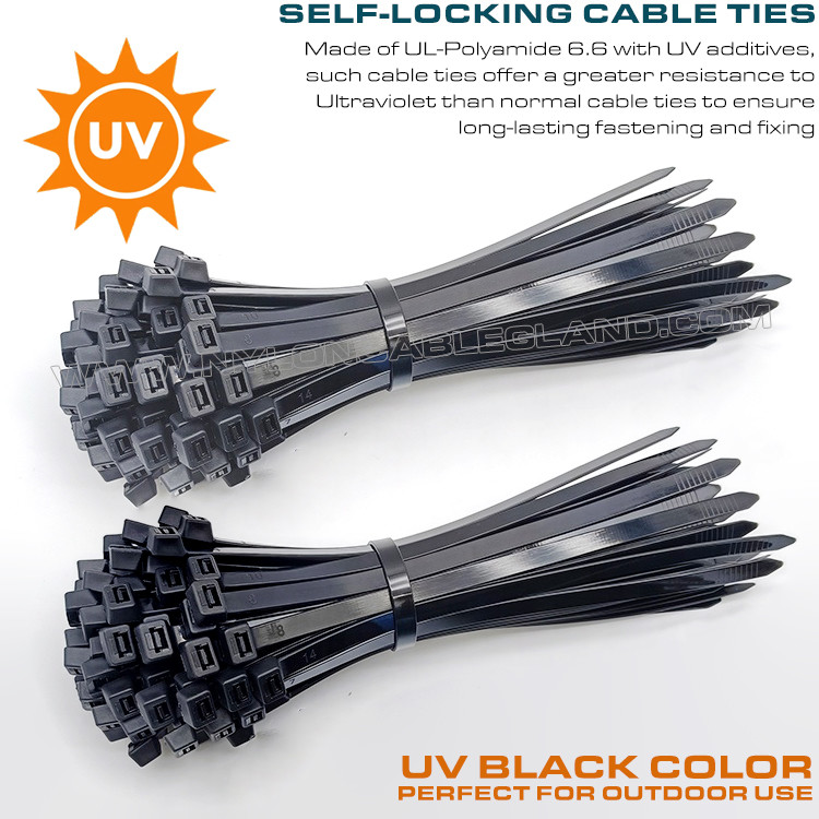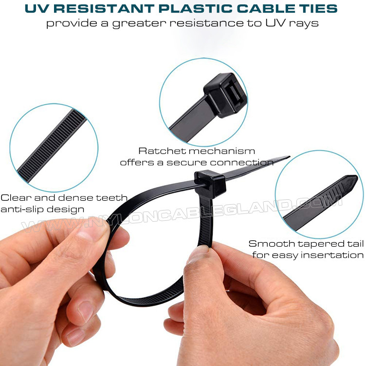 As abraçadeiras resistentes aos raios UV são um tipo de abraçadeiras fabricadas em materiais especiais, concebidas para ambientes exteriores e com elevada radiação UV. A sua capacidade de resistir aos raios UV do sol é aumentada pela adição de aditivos resistentes aos UV, como o negro de fumo. Parecem abraçadeiras comuns na aparência, mas graças aos aditivos proporcionam um desempenho duradouro e fiável tanto para uso industrial como doméstico diário, especialmente em ambientes exteriores. É adequado para uma variedade de cenários industriais (por exemplo, amarração de cabos de comunicação, fixação de painéis solares), bem como para uso doméstico diário (por exemplo, amarração de equipamentos de jardinagem, manutenção de instalações exteriores), o que é uma solução de amarração durável e fiável.el.