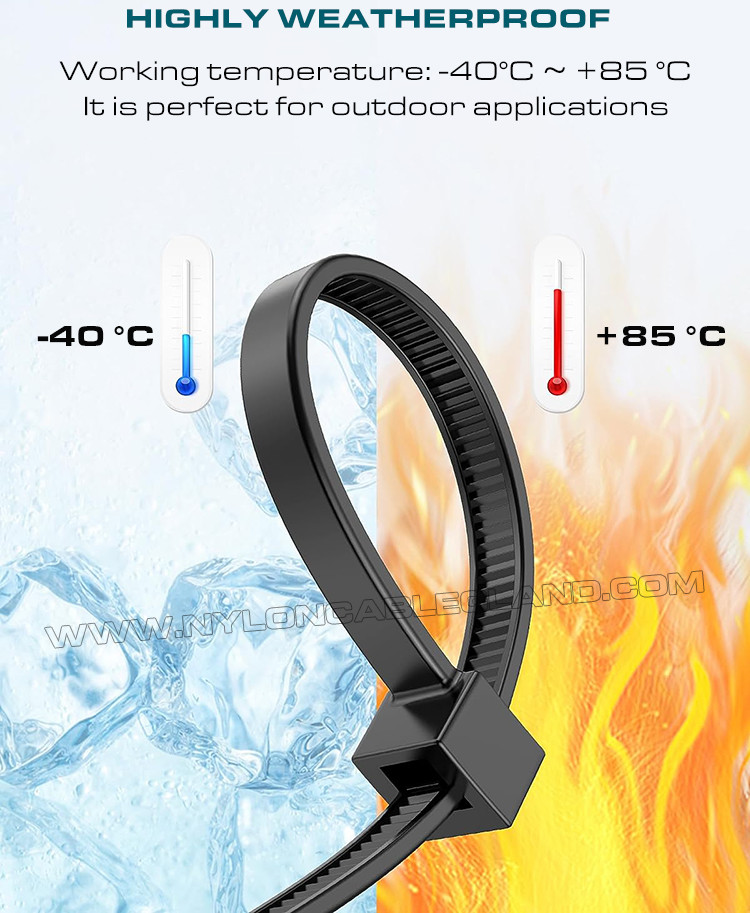 (2) Proteção UV melhorada: feitos de poliamida 6.6 preta premium (UL 94V-2) com aditivos UV, são resistentes às intempéries, isolantes e não envelhecem, podendo ser utilizados em ambientes de -40℃ a 85℃ (40°F - 185°F).