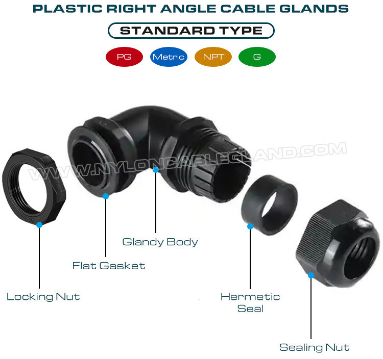 | Nome do produto: | Prensa-cabos plásticos IP68 em ângulo reto (cotovelo) PG9~PG29 / M16~M32 / NPT3/8"~NPT1" com roscas PG, métricas e NPT |