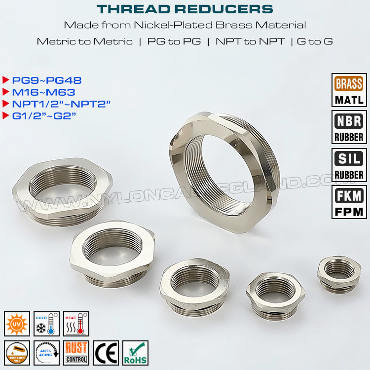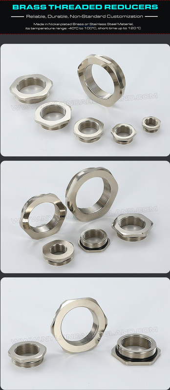 Feitos de latão ou aço inoxidável 304, 316 ou 316L, eles são novos acessórios padrão que são usados para reduzir, ampliar ou adaptar tamanhos de rosca, eles são projetados com tipo redondo ou hexagonal e estão disponíveis em uma seleção de tamanhos padrão. Adicione roscas do mesmo tamanho ou menores aos furos de folga, adapte furos roscados para diferentes tamanhos ou sistema de unidade, eles fornecem um método de conexão direto e confiável entre prensa-cabos e roscas menores.